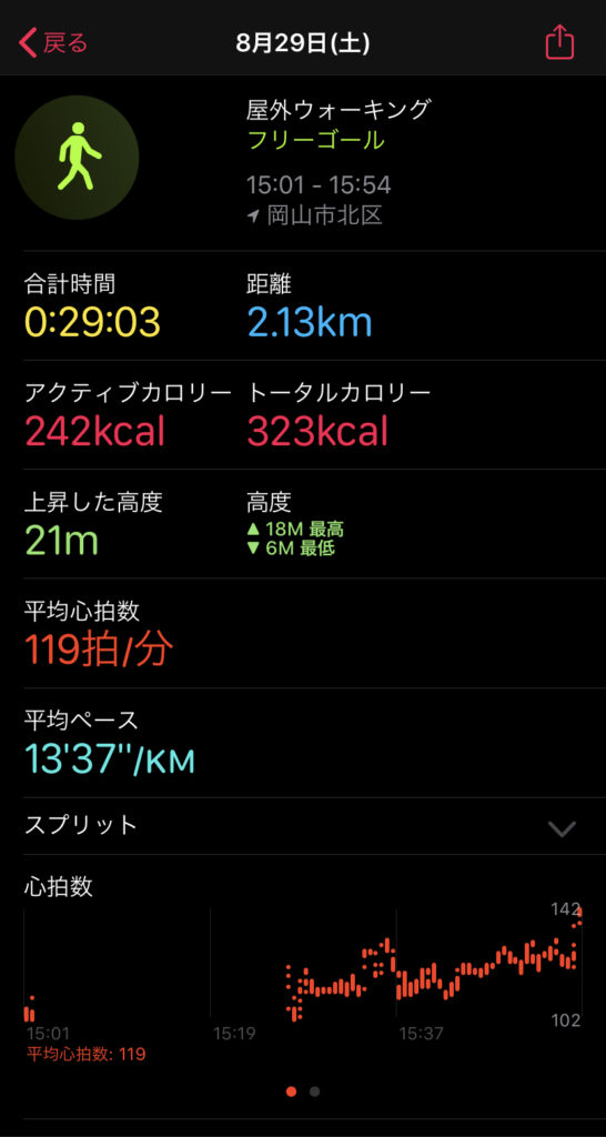 心拍数についてはなぜか途中中断したことになっており、計測できていなかったです。音楽を聞いていたので操作時にボタンか何かを押してしまったのかもしれません。