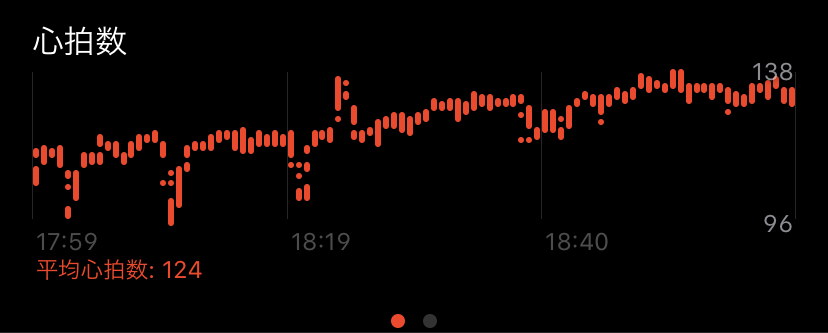 平均心拍数は毎分124回なので、正直そこまできついと感じていないです。前半信号でつかまるたびに息を整えました。途中1カ所だけ急に心拍数が上がっているところがありますが、この辺りでマスクを外して歩き始めた地点となります。