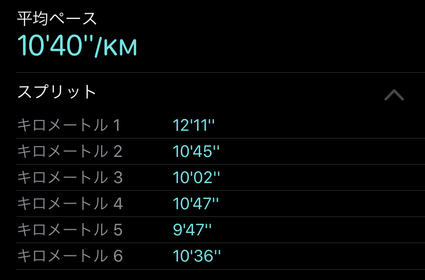 スプリットの詳細ですが、最初の1キロは信号が多くほぼ全ての信号に捕まりました。それ以外はスムーズに歩くことができていてスプリットも10分台でいい感じでした。