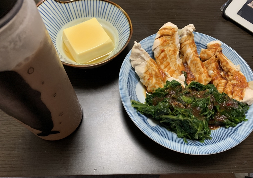 夕食の鳥のささみ。豊富なタンパク質と糖質0なので減量食にはもってこいなのですが、いかんせんパサパサしていて苦手です。かといって油を引いて焼くと脂質が増えるので難しいところです。