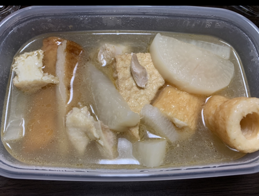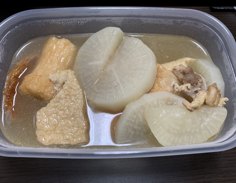 まとめてつくったおでん最終日。おでんは食材を圧力鍋に入れるだけでできるので料理苦手な人にはおすすめです。コトコト煮込んで作るおでんだと多分作ってないかもしれません。ゆでたまごは写真にはありませんがタンパク質をとるために食べました。