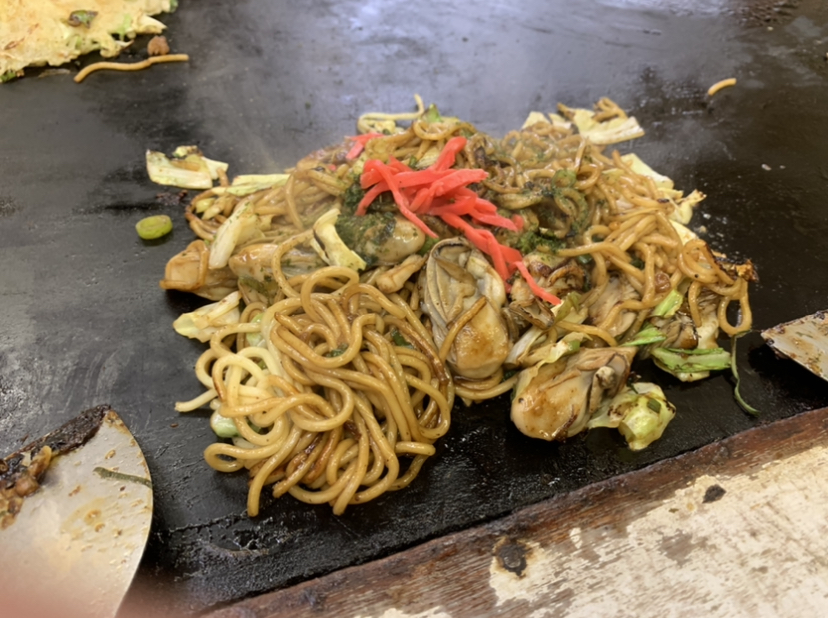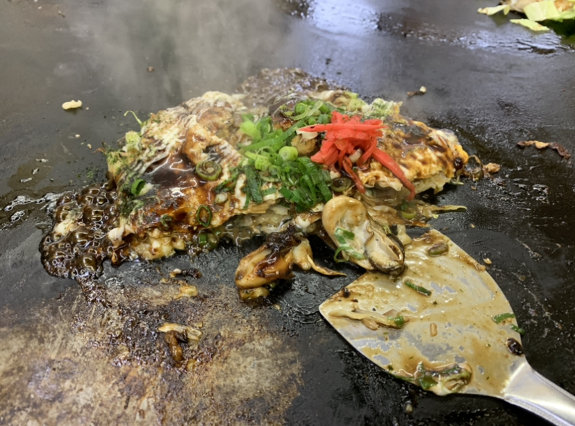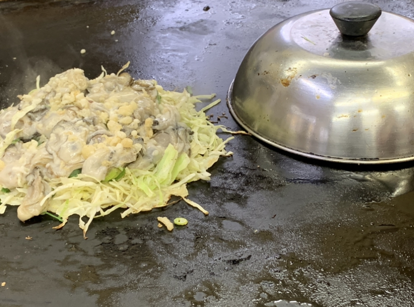 じゅうじゅうと音を立ててカキオコが調理されていきます。出来上がりがこちら。