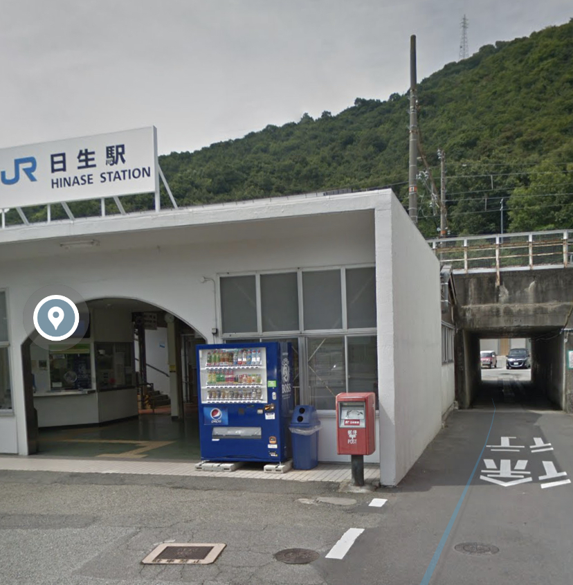 播州赤穂線日生駅の真横に駅の反対側に抜ける道があります。海にみとれていると見逃しますのでお気をつけください。(私は2往復してようやく見つけました)車高の高い車だと当たっちゃうかも。