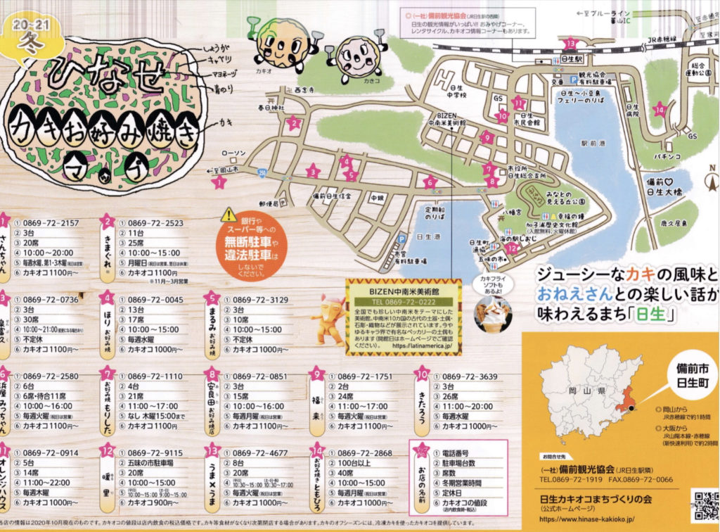 日生は町全体でカキオコ推しの町になっており、日生カキオコまちづくりの会が、日生町でカキオコが食べられるお店のパンフレットを作っています。それがこちら。