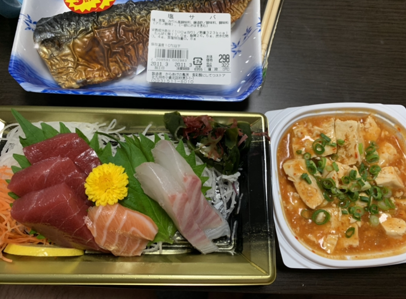 刺し身と麻婆豆腐ですが、チャチャタウンにあるにしてつストアで買ってきたものです。商品に成分表がついていなかったため、【カロリー計算/カロリーSlism】さんよりカツオのたたきから算出しました。麻婆豆腐についても同様です。