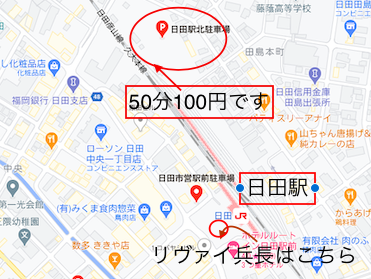 下図に簡単な図を載せていますが、近くに市営駐車場があるので是非ご利用ください。約1時間で100円なので、リヴァイ兵長との記念撮影後に食事をする余裕もありそうです。