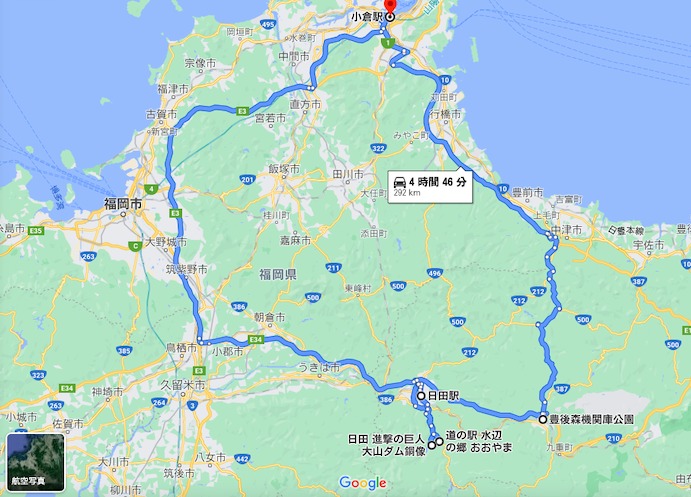 今回私は小倉駅から車で4つのスポットを移動しました。参考になるか分かりませんが、移動ルートを載せておきます。総走行距離は約300kmとなります。