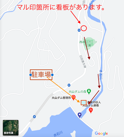 「3人の銅像を見たい方はここを曲がる」といった具合の看板が直前の道路脇に敷設されていますので、よく見て運転していれば見逃すことはないと思います。参考までに下図に大山ダムに行くための簡易図を載せておきます。
