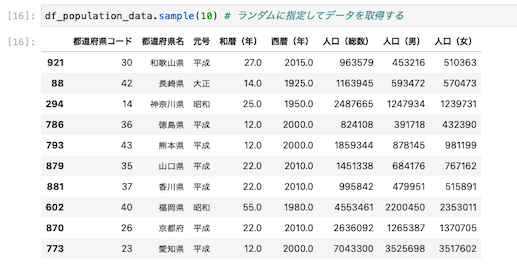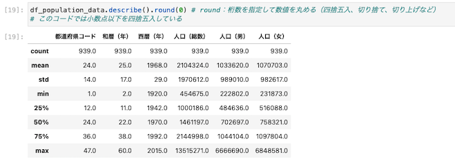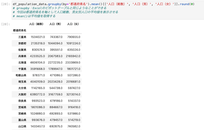 | df_population_data.groupby(by=’都道府県名’).mean()[[‘人口(総数)’, ‘人口(男)’, ‘人口(女)’]].round(0) |