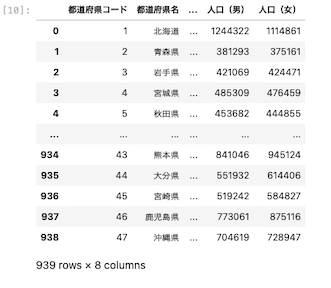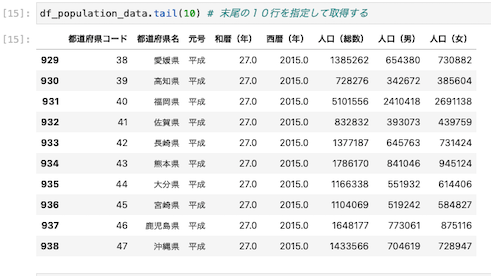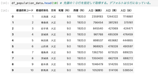 ちなみにascending=Falseの部分を、ascending=Trueと書き換えると、人口総数の少ない順に並べ替えることができる。