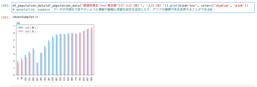 | df_population_data[df_population_data[‘都道府県名’]==’東京都’][[‘人口(男)’, ‘人口(女)’]].plot(kind=’bar’, color=[‘skyblue’, ‘pink’]) |