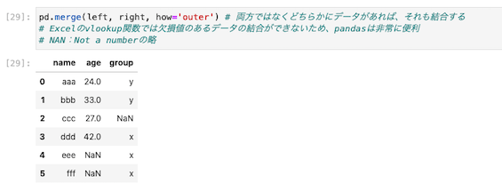 Excelのvlookup関数ではこのような欠損値(どちらか片方にしかデータがない)のあるデータは結合できないため、その点Pandasは非常に便利
