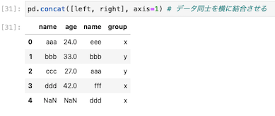 データを縦に結合したときのコードと異なるのは、文末にaxis=1が追加されたこと。