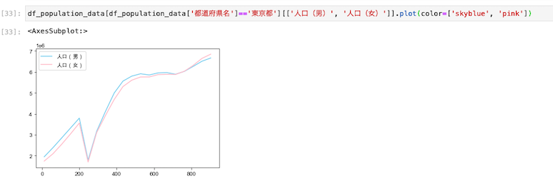| df_population_data[df_population_data[‘都道府県名’]==’東京都’][[‘人口(男)’, ‘人口(女)’]].plot(color=[‘skyblue’, ‘pink’]) |