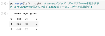 | left = pd.DataFrame({‘name’:[‘aaa’, ‘bbb’, ‘ccc’, ‘ddd’], ‘age’:[24, 33, 27, 42]}) |