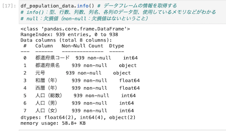 取得したデータ内にnon-nullとあるが、これはデータ内に欠損値がないことを示している