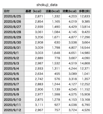 記録項目は、日付、基礎(kcal)、活動(kcal)、消費(kcal)、歩数(歩)の5項目。