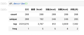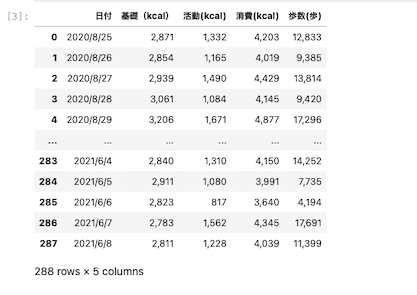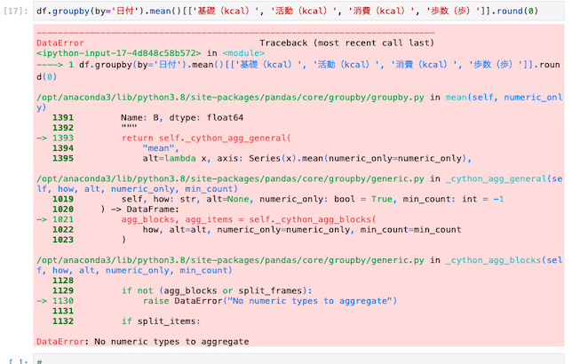 | df.groupby(by=’日付’).mean()[[‘基礎(kcal)’, ‘活動(kcal)’, ‘消費(kcal)’, ‘歩数(歩)’]].round(0) |