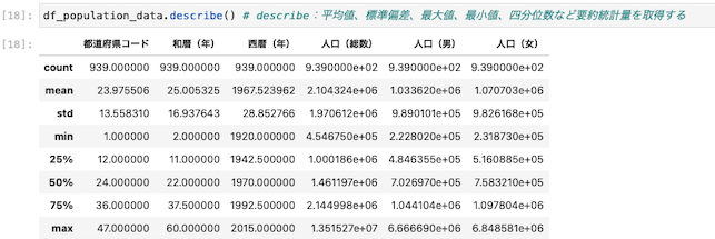 要約統計量と取り出してみると、なんだか動画で見たものとは異なるものが出てきた。