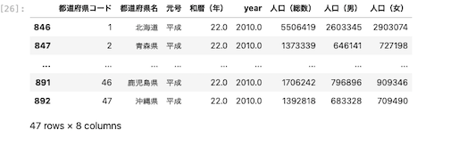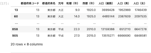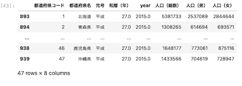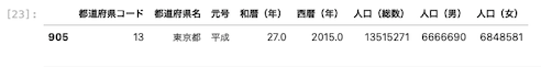| df.query ( ‘ 都道府県名 ‘ == ” 東京都 ” and year == 2015 ‘ ) |