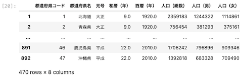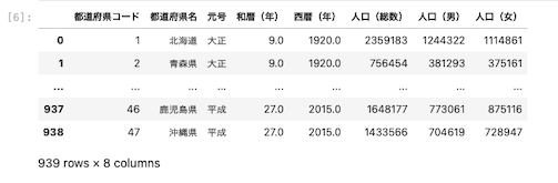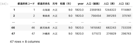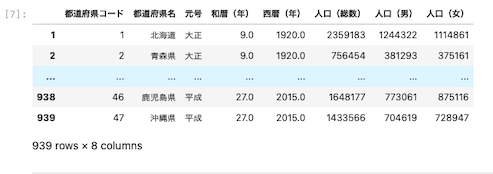 | df = df.rename ( columns = { ‘ 西暦(年) ‘ : ‘ year ‘ } ) df |