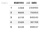| df [ [ ‘ 都道府県名 ‘ , ‘ 人口(総数) ‘ ] ] [ : 5 ] |