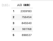 | df [ [ ‘ 人口(総数) ‘ ] ] [ : 5 ] |