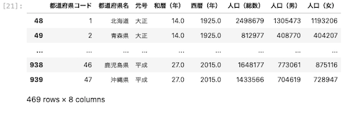| df [ df [ ‘ 都道府県名 ‘ ] . str . endswith ( ‘ 道 ‘ ) ] |