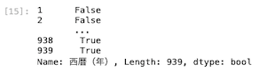上図のように、西暦(年)を10で割って余りが0のデータはTrueが表示され、余りが0にならないデータについてはFalseが返ってきた。