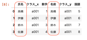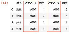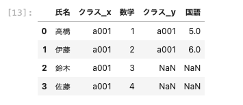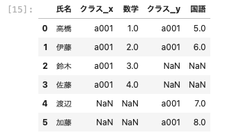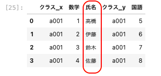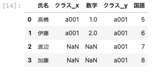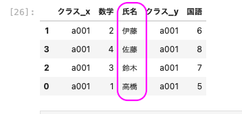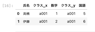 | pd.merge ( df01, df03, left_on = [ ‘ 氏名 ‘ , ‘ クラス ‘ ] , right_on = [ ‘ 名前 ‘ , ‘ クラス ‘ ] ) |