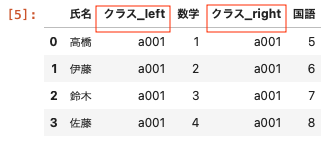 | pd.merge (df01 , df02 , on = ‘ 氏名 ‘ , suffixes = [ ‘ _left ‘ , ‘ _right ‘ ] ) |