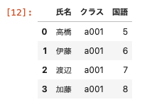 | df04 = pd.DataFrame ( { ‘ 氏名 ‘ : [ ‘ 高橋 ‘ , ‘ 伊藤 ‘ , ‘ 渡辺 ‘ , ‘ 加藤 ‘ ] , ‘ クラス ‘ : [ ‘ a001 ‘ , ‘ a001 ‘ , ‘ a001 ‘ , ‘ a001 ‘ ] , ‘ 国語 ‘ : [ 5 , 6 , 7 , 8 ] } ) df04 |