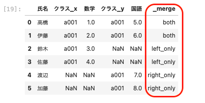 | pd.merge ( df01, df04, on = ‘ 氏名 ‘ , how = ‘ outer ‘, indicator = True ) |