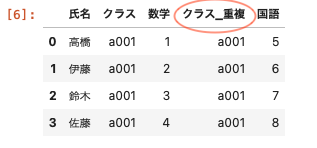 | pd.merge ( df01 , df02 , on = ‘ 氏名 ‘ , suffixes = [ ‘ ‘ , ‘_重複 ‘ ] ) |