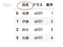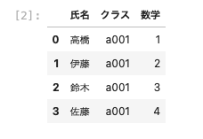 | df05 = pd.DataFrame ( { ‘ クラス ‘ : [ ‘ a001’ , ‘ a001 ‘ , ‘ a001 ‘ , ‘ a001 ‘ ] , ‘ 数学 ‘ : [ 1 , 2 , 3 , 4 ] } , index = [ ‘ 高橋 ‘ , ‘ 伊藤 ‘ , ‘ 鈴木 ‘ , ‘ 佐藤 ‘ ] ) df05 |