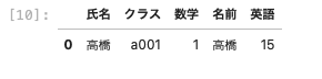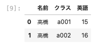 | df03 = pd.DataFrame ( { ‘ 名前 ‘ : [ ‘ 高橋 ‘ , ‘ 高橋 ‘ ] , ’ クラス ‘ : [ ‘ a001 ‘ , ‘ a002 ‘ ] , ’ 英語 ‘ : [ 15, 16 ] } ) df03 |