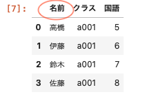 | df02_name = pd.DataFrame ( { ‘ 名前 ‘ : [ ‘ 高橋 ‘ , ‘ 伊藤 ‘ , ‘ 鈴木 ‘ , ‘ 佐藤 ‘ ] , ‘ クラス ‘ : [ ‘ a001 ‘ , ‘ a001 ‘ , ‘ a001 ‘ , ‘ a001 ‘ ] , ‘ 国語 ‘ : [ 5 , 6 , 7 , 8 ] } ) df02_name |