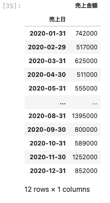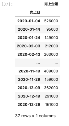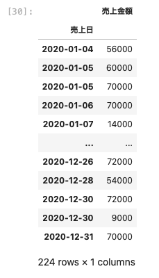 データを簡易的に見ることができるように、次のような売上日と売上金額のデータフレームを用意する。