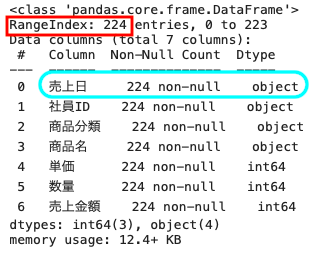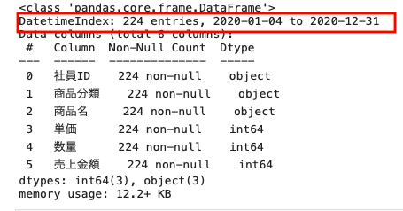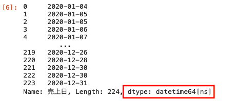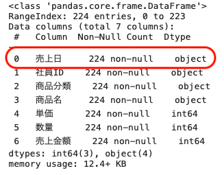 上記のとおり、売上日のデータ型はオブジェクト型、つまり文字列となっている。