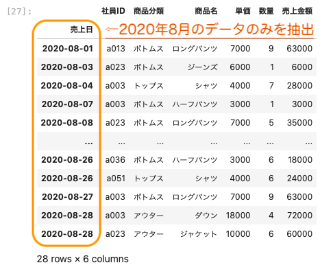 2020年8月のデータのみを抽出する場合には次のように記述する。