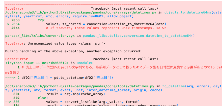 to_datetime関数で日付型を変更したはずなのにエラーが出た