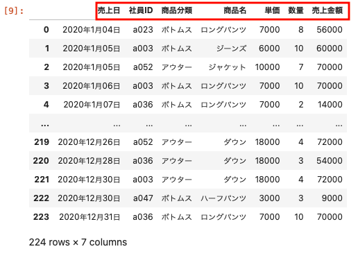 1行目のカラムに売上日や社員IDなどの項目が表示されているため、header=0と記述することで、1行目をカラムとして指定する