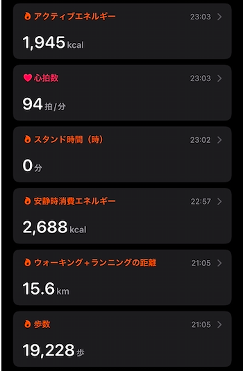 昨日よりは歩行距離は若干落ちたもののそれでも15.6kmを獲得しました。