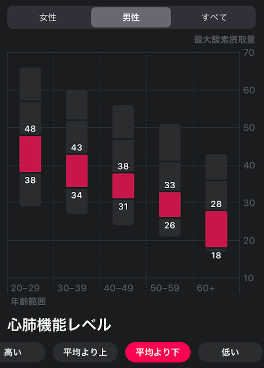 ちなみに私は同年代平均で見てみると、一応平均値内にはいるものの最底辺であり、もっと最大酸素摂取量を上げることが必要だと感じています。