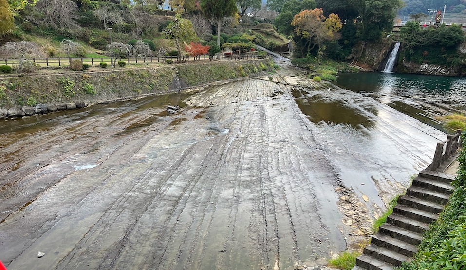 奥に滝が流れており、手前には川底が段々に見えており川の流れも大変ゆっくりな流れとなっています。