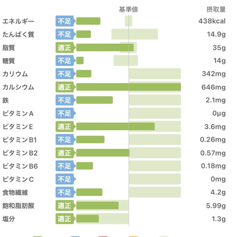 カルシウムやや不足(128mg)納豆・野菜は頑張ってる!でもあと牛乳 or 小魚 or 豆腐系で補えると完璧!